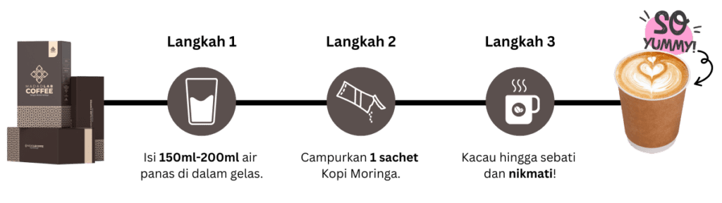 Untuk menyediakan Kopi Moringga, hanya campurkan 1 sachet dengan 150ml air panas atau sejuk. Kacau sehingga larut dan nikmati!