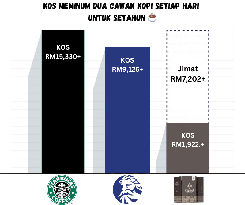 Dengan memilih Kopi Moringga, anda boleh jimat sehingga RM13,407.67 berbanding Starbucks dan RM7,202.67 berbanding Zus Coffee setiap tahun.